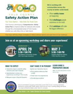 Yolo County is developing a Comprehensive Safety Action Plan to improve safety for everyone who travels through the unincorporated areas of Yolo County— whether you walk, bike, drive, or take transit.