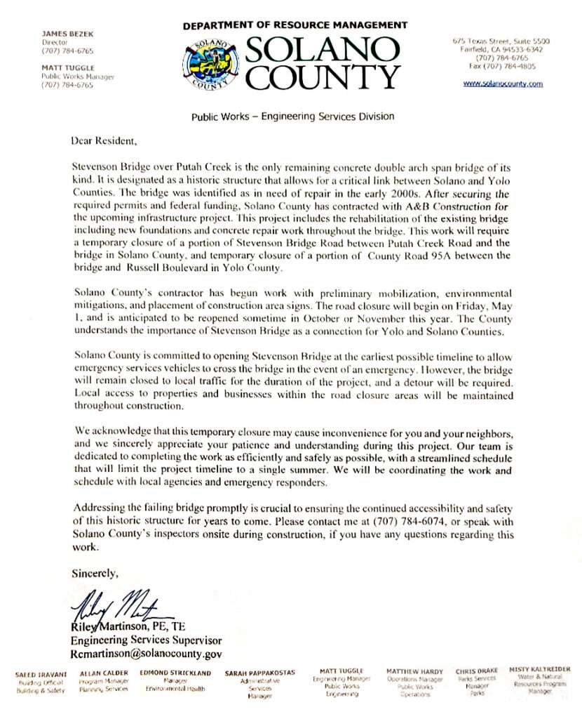 Stevenson Bridge, located on the Solano-Yolo county line about halfway between Davis and Winters is a favorite, low traffic cycling route between Davis and Winters, as well as between the west side of Davis and other areas of Solano County including Vacaville. The closure of the bridge for up to seven months in 2026 is necessary for the long delayed Stevenson Bridge Rehabilitation Project.