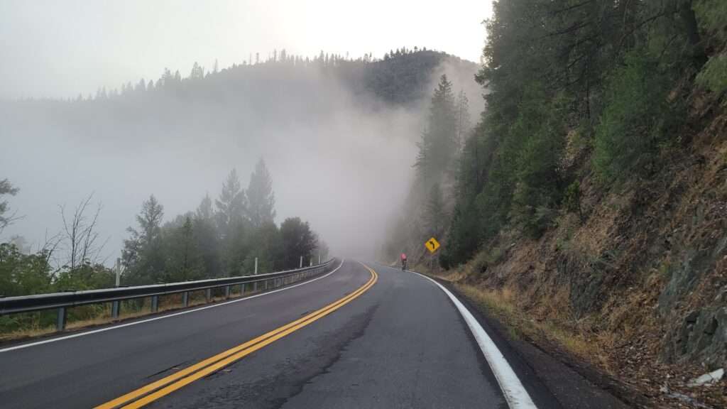 Descending Feather River Canyon in the pre-dawn twilight of Day 4, my mind wandered into normally forbidden areas, thinking about how far the ride had come and how much remained. I thought about the preceding three days battling in the Sierras and considered with dread the impending 90 mile crossing of California’s Central Valley back to Davis, with its baking sun and feared headwinds. The descent itself invited such reflection. There was no traffic at this early hour, the peaceful river flowed on my left or right, depending on the last bridge, and the light slowly rose between the steep canyon walls.
