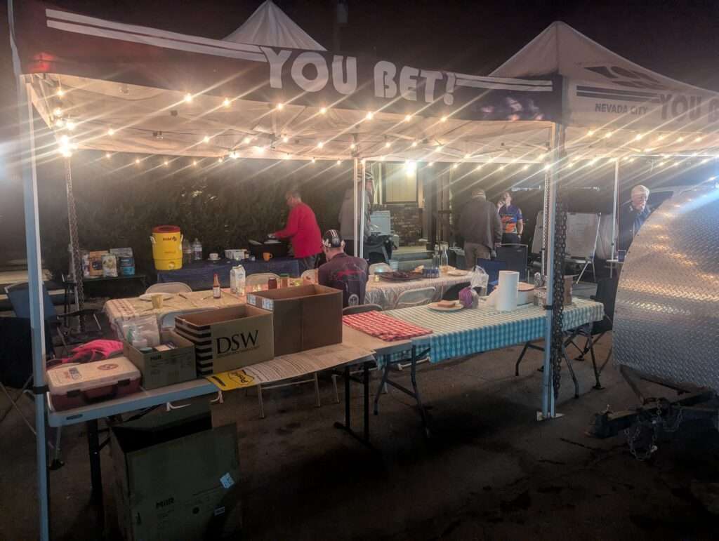 Chef Gary Parsons from Nevada City and longtime supporter of Davis randonneuring events wowed us once again with his outdoor kitchen. Situated in the parking lot of the Gold Pan Lodge a complete outdoor kitchen was created with two stoves, a BBQ grill, a freezer and two fridges and an espresso machine. Under the canopies, we had a full dining room with plates, silverware, and individual GRR insulated mugs, (which riders took home after the event as a memento). Gary provided two freshly cooked meals a day serving over 300 individual meals for the riders and volunteers during the event. Alongside Gary, Bill Green created an outdoor washing station that was as green as his name. A full outdoor sink powered by an instant hot water heater, cleaned dishes and cutlery, followed by a rinse and then a second bleach rinse. Grey water went into a large tub, and then re-filtered into a second tub. Once sludge filtered to the bottom of the second tub, grey water was hosed directly into the sewer system. Waste from cooking was 100% recycled. It was something to be proud of!